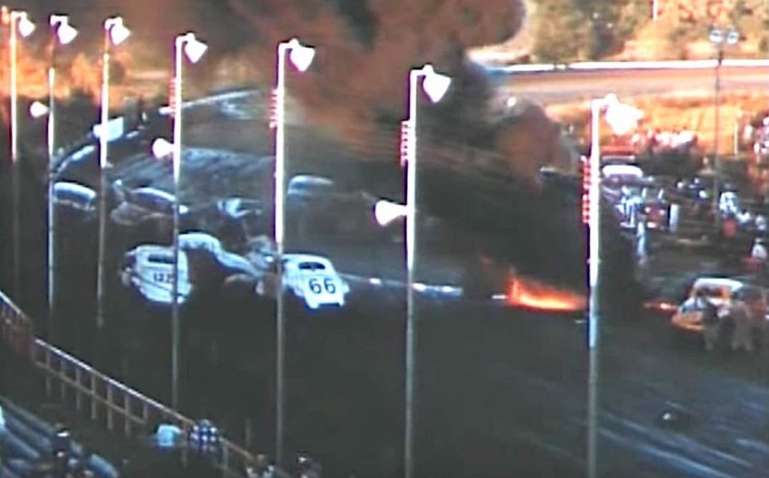 Dick Eagan, qui a pris le volant de la voiture de Hully Bunn, mène la course quand un compétiteur percute de plein fouet la barrière extérieure de la piste dans ce qu’on appelle le virage 4 (ironique pour une piste ronde...). Celui qui le suit, Wally Campbell, arrive sur la scène à haute vitesse et le percute de plein fouet. Le réservoir d’essence de la voiture de Campbell est perforé et le carburant fuit sur la piste. Puis, sa voiture prend feu, mais il parvient à s’en extraire rapidement. S’en suit un gigantesque carambolage avec des voitures qui se tamponnent violemment dans tous les sens.