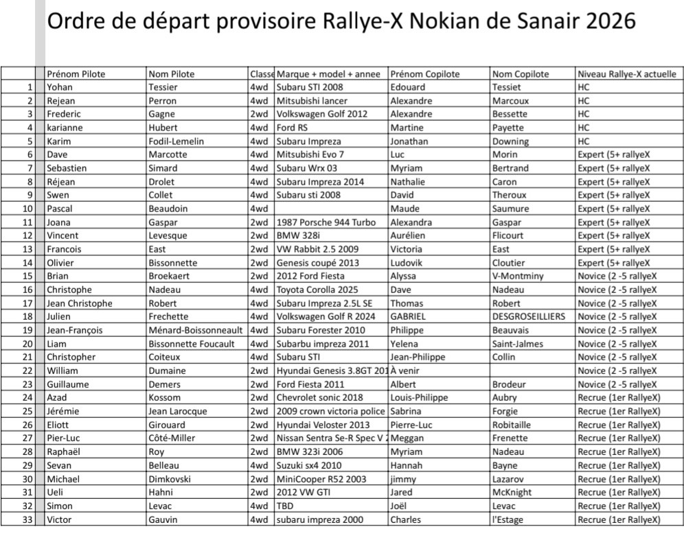 Initialement prévu le premier samedi de mai puis avancé à ce samedi 25 avril, l’événement qu’organise le Club Autos Sport La Licorne, avec pour partenaires Nokian, MS Gear et KMplus.ca, comptera au départ 5 équipages hors championnat (doté d’une expérience en Rallye national ou de Championnat du Québec donc non éligibles aux points du Championnat des Rallyes X), 9 en classe Expert (plus de 5 Rallyes X d’expérience), 9 Novices (2 à 5 Rallyes X d’expérience) et pas moins de 10 recrues, soit les concurrents en étant à leur tout premier événement dans la série. 18 voitures 4 roues motrices et 15 2RM forment ce très beau peloton de 33 équipes. Pour découvrir l’ordre de départ, cliquez ici.